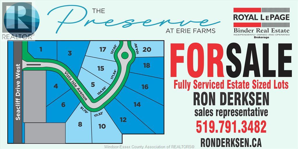 Welcome to ""the Preserve"" at Erie Farms, an upscale Subdivision featuring estate-sized lots offering breathtaking views of Lake Erie, beautiful sunsets, including Pelee Island views and located just south and west of Seacliff Drive West and Fraser Road in Leamington Ontario. The fully serviced ""one of a kind"" subdivision featuring street lights, sidewalks. sanitary and storm water drainage, all utilities, mail, lake views. Easy access to walking and biking trails is an absolutely stunning development with Municipal of Leamington building permits available for February 11/2026. (id:4555)